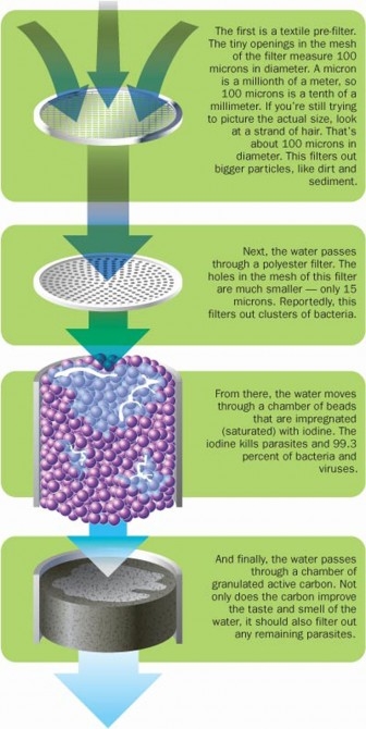 The LifeStraw contains a number of filters and a pharmaceutical pouch that clean the water and treat it chemically. There are no electrical or moving parts and no maintenance is required - simply blow back after use to remove the debris that has been filtered.